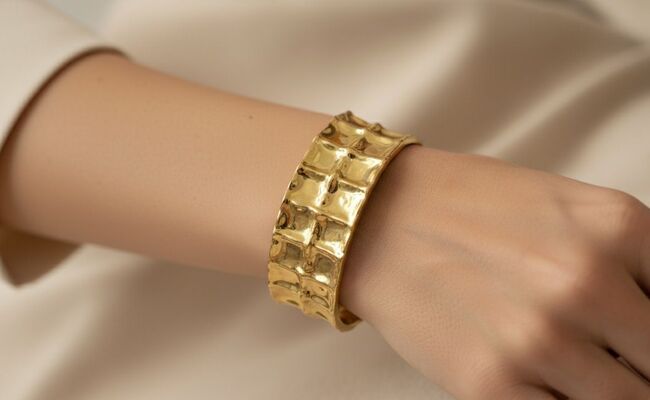 Bracciale schiava quadrati di dimensione media, realizzato artigianalmente in argento 925 bagnato in oro giallo.