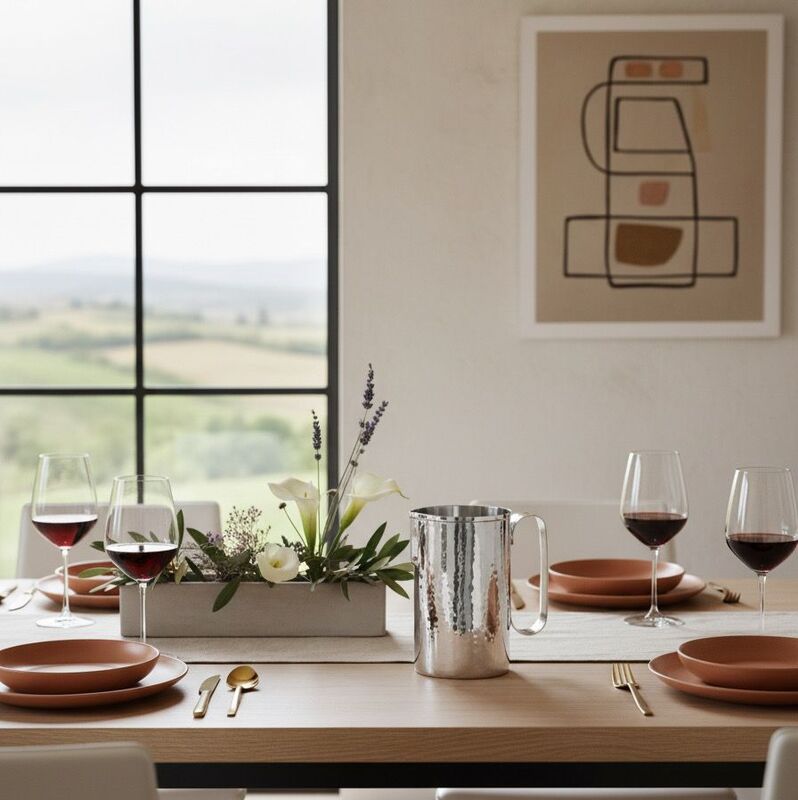 Brocca cilindrica martellata realizzata in argento 925 per acqua o vino.